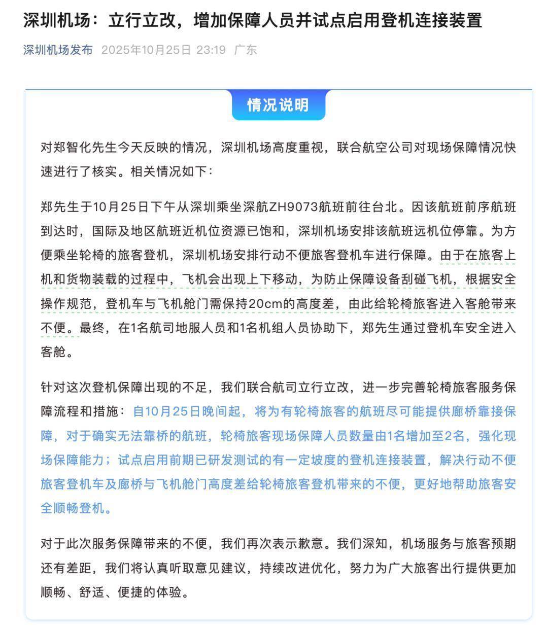 深圳机场表示,针对这次登机保障出现的不足,机场联合航司立行立改,进一步完善轮椅旅客服务保障流程和措施:自10月25日晚间起,将为有轮椅旅客的航班尽可能提供廊桥靠接保障,对于确实无法靠桥的航班,轮椅旅客现场保障人员数量由1名增加至2名,强化现场保障能力;试点启用前期已研发测试的有一定坡度的登机连接装置,解决行动不便旅客登机车及廊桥与飞机舱门高度差给轮椅旅客登机带来的不便,更好地帮助旅客安全顺畅登机。